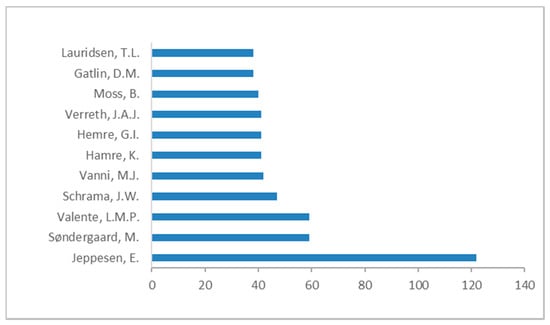 Figure 4 reports the most productive authors. The most productive author is Jeppesen, E., having 122 documents. His most-cited document showed an analysis of contemporary long-term data from 35 case studies concerning the lake responses to reduced nutrient loading [], whereas his most recent document focused on consequences for taxonomic and functional diversities, and ecosystem multifunctionality, through a case study on regime shifts in a shallow lake over 12 years [].