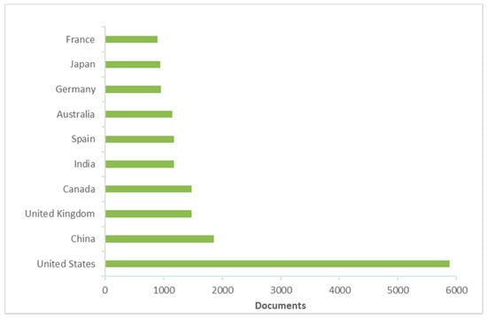 Figure 5 and Figure 6 report, respectively, the most productive countries/territories and institutions. Among the countries/territories, United States (n = 5877) is the most productive country, followed by China (n = 1857), and United Kingdom (n = 1478).