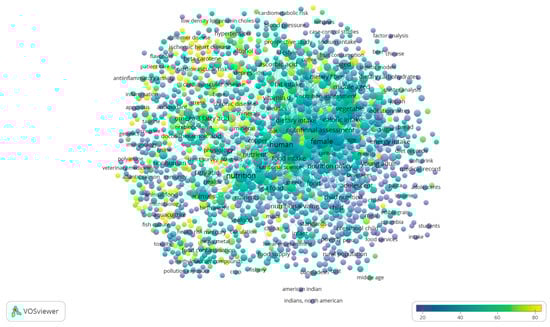 Term map of the seafood/fish/nutrients/bioactive compounds relationship, shown as a bubble map visualizing words from titles, abstracts, and keywords of the 1227 publications. Bubble size indicates the number of publications. Bubble color represents the citations per publication (CPP). Two bubbles are closer to each other if the terms co-appeared more frequently. (Based on data from Scopus and elaborated by VOS viewer software).