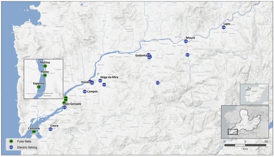 The Minho River is the only area in Portugal where glass eel fishery still legally occurs, and until the ban imposed in 2011, the yellow and silver eel fisheries were also economically, socially, and culturally important. Minho has a separated eel management plan from the rest of the Portuguese rivers; therefore, the data provided here can help inform the success of its implementation. It also has a great ecological value, with several areas classified as a Natura 2000 site. In the European context, this ecosystem is of reference, as it integrates an extensive monitoring program that provides ICES with estimates for the status of the European eel in Portugal, and is of relevance as a particular example of cross-border eel management. This study was conducted under the Sudoang project, which aimed at developing common management and assessment tools, obtaining coordinated and long-term monitoring strategies, and reinforcing cooperation between stakeholders in the Southwest Europe (Sudoe) area. The Minho River was part of an eel sampling network that included 10 pilot basins in the Mediterranean and Atlantic which were representative of the different ecosystems of the Sudoe area.