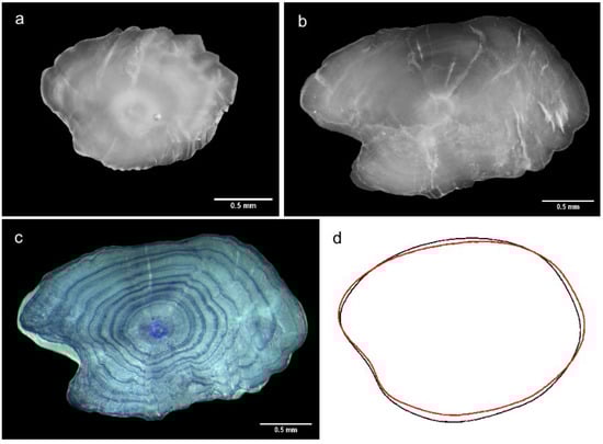 - Campana, S.E.; Neilson, J.D. Microstructure of fish otoliths. Can. J. Fish. Aquat. Sci. 1985, 42, 1014–1032. [Google Scholar] [CrossRef]