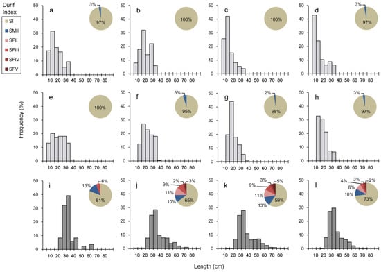 Catch length composition of the eels collected in the tributaries ((a) Coura, (b) S.Gonçalo, (c) Campos, (d) Insuas, (e) V.Mira, (f) Gadanha, (g) Mouro, and (h) Lajes) and in the estuaries ((i) Caminha, (j) Espanha, (k) Ponte, and (l) Marina). Pie charts present the proportion of individuals sampled according to the life stage classification based on the Durif Silvering Index (Durif et al. 2009): yellow resident (SI and SFII), female pre-migrant (SFIII), silver female (SFIV and SFV), and silver male (SMII).