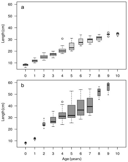Boxplot of age-at-length data for eels collected in the (a) tributaries and (b) estuary. Thicker boxes indicate a higher number of eels for the corresponding age class.
