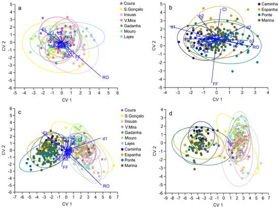 Shape Indicies (SI) and Elliptic Fourier Descriptors (EFD) values and variable individual results are in Tables S1 and S2, respectively. In the tributaries, otolith shape differed between a few locations in the tributaries: Coura from Insuas and Lajes, Mouro from Insuas and Gadanha, and S.Gonçalo from Lajes (MANOVA, Pillai´s Trace, F1.6049 = 0.999, p < 0.05). The LDA, through the Jackknife reclassification matrix, showed that Lajes was the site with the best reclassification value (40%), but the overall reclassification success was low (26%; Table 3. The lack of specific groups can be visualized in the CVA plot (Figure 5a). Vectors’ overlay shows the RO as the most prominent variable for group characterization. The otolith shape of eels collected in the brackish sampling location (Caminha) was different from those collected in the TFW (MANOVA, Pillai´s Trace, F1.799 = 0.589, p < 0.05). The LDA, through the Jackknife reclassification matrix, showed good reclassification success for Caminha (57%), but an overall poor reclassification success for the eels collected in the estuary (34%; Table 3). The discrimination of Caminha can be visualized in the CVA plot, where vector overlays show the prevalence of the otolith outline EFD variables d1, b2, and b3 (Figure 5b). Otolith shape proved to be successful in differentiating eels from tributary vs. estuary habitats (MANOVA, Pillai´s Trace, F83.883 = 0.842, p < 0.05). The LDA, through the Jackknife reclassification matrix, showed an overall reclassification success of 98%, with complete reclassification success for the tributary habitat (100%; Table 3). The discrimination of both habitats can be visualized in the CVA plot (Figure 5c). Additionally, the CVA plot of the undifferentiated eels shows similar results (Figure 5d). Vector overlays show that the SI variables RO and CI describe the otoliths of the individuals collected in the tributaries, whereas EL and RE describe the otoliths of the individuals collected in the estuary. Otolith outline EFD variables d1, b2, c2, b4, d3, d4, and b3 also contribute to the discrimination between groups.