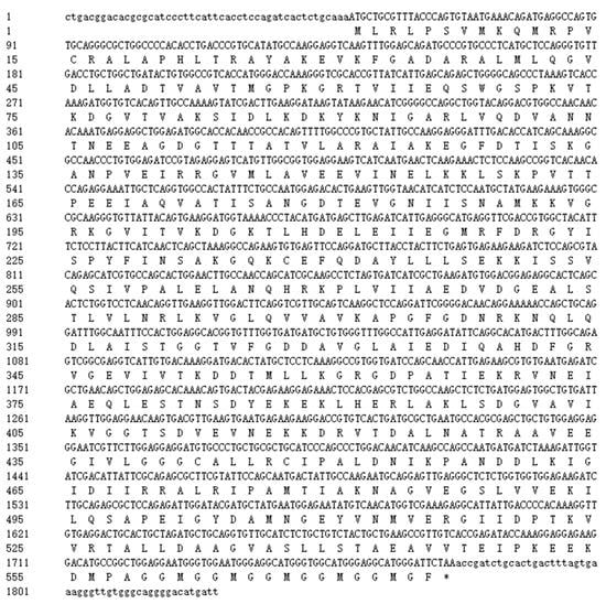 The full-length cDNA nucleotide sequence and corresponding amino acid sequence of SpHSP60; * indicates a stop codon.