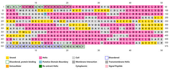 The full length of the SpHSP60 gene (GenBank accession number ON245159) is 1826 bp, including an ORF of 1728 bp. The predicted ORF encodes a protein of 575 amino acids (Figure 1) that has a calculated molecular mass of 61.32 kDa and a theoretical isoelectric point of 5.54. The secondary structure composition of the SpHSP60 protein is shown in Figure 2. According to the prediction result, the SpHSP60 protein has strands, helices, coils, a transmembrane helix, etc. The predicted 3D structure of the SpHSP60 protein (Figure 3a) shows that there is an adenosine-5′-diphosphate binding site, a magnesium ion binding site, a beryllium trifluoride ion binding site and a potassium ion binding site (Figure 3b). Multiple amino acid sequence alignment revealed a high degree of identity with HSP60.