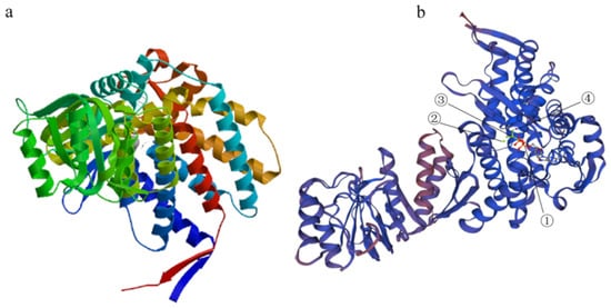 The 3D-structural models of SpHSP60 and binding site prediction: (a) indicates the 3D-structural models of SpHSP60; (b) indicates binding site prediction. ① Adenosine-5′-diphosphate binding site, ② magnesium ion binding site, ③ beryllium trifluoride ion binding site, ④ potassium ion binding site.