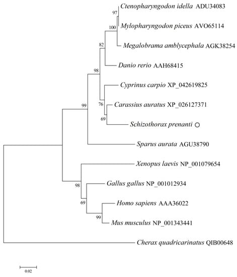 A phylogenetic analysis of the amino acid sequences of SpHSP60 was performed to study the evolutionary relationship with other vertebrates (Figure 4). The sequences were obtained from the GenBank database. The results showed that the amino acid sequence of SpHSP60 has higher identity with Cyprinids and has the highest identity with the HSP60 of Carassius auratus (97.72%).