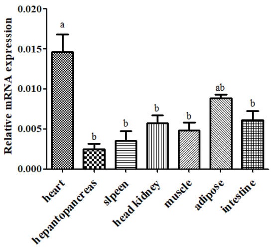 The expression of SpHSP60 mRNA was examined in different tissues from four unchallenged Yang fish using qPCR, with β-actin as the internal control. As shown in Figure 5, SpHSP60 transcripts were ubiquitously expressed in all the tissues examined, including the heart, hepatopancreas, spleen, head kidney, muscle, adipose and hindgut; the levels obviously varied among different tissues. The relative expression of SpHSP60 was significantly higher in the heart than in other tissues (p < 0.05), except for adipose. No significant difference in SpHSP60 mRNA expression was observed in tissues except for the heart (p > 0.05). Indeed, the highest expression level of SpHSP60 in the heart was nearly six times the lowest expression level in the hepatopancreas (Figure 5).
