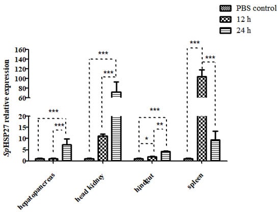 As shown in Figure 6, the mRNA relative expression levels of SpHSP27 were upregulated with extreme significance in all the tissues examined at 24 h after LPS challenge (p < 0.001). The expression level peaked 12 h post-injection only in the spleen; this was also the highest expression level of the SpHSP27 gene in this study, and was significantly higher than that of the PBS control group and the 24 h LPS injection group (p < 0.001). It was also overexpressed in the head kidney 24 h after LPS injection, second only to the level in the spleen 12 h after LPS injection. The transcript levels of SpHSP27 in the hepatopancreas, head kidney and hindgut may have not reached their peak at 24 h after LPS challenge, whereas they were markedly higher than those in the PBS-injection group (p < 0.001). Indeed, the intestinal expression level of SpHSP27 at 12 h was also higher with extreme significance than that of the PBS control group (p < 0.01).