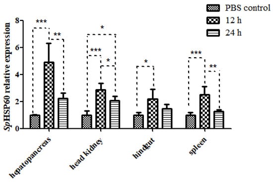 The results of the temporal transcription level of SpHSP60 after the fish were injected with LPS are shown in Figure 7. The gene in the four tissues examined showed a fairly consistent expression pattern within 24 h: significantly upregulated 12 h post-injection, and then downregulated 24 h post-injection. At 24 h of LPS stimulation, expression levels in the hepatopancreas, hindgut and spleen appeared to have no difference compared with those of the PBS control group, except that the level in the head kidney was higher with pronounced significance (p < 0.05). The results showed that the relative expression levels of SpHSP60 in the hepatopancreas and spleen were extremely significantly increased at 12 h (p < 0.001), and then decreased with marked significance at 24 h (p < 0.001); there were no significant differences found in their 24 h relative expression levels compared with the PBS control group. The expression of SpHSP60 in the head kidney had increased with extreme significance by 12 h (p < 0.001), and significantly decreased by 24 h (p < 0.05). The level at 24 h was still markedly higher than that of the control group (p < 0.01). The intestinal expression level had increased significantly by 12 h (p < 0.05), and no significance was found at 24 h.