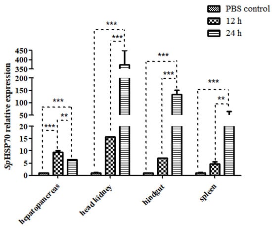 As shown in Figure 8, the transcription levels of SpHSP70 in the four tissues examined were also evaluated after stimulating with LPS. In general, the expression level of the SpHSP70 gene was the highest in the four induced SpHSPs examined in this study. The level in the head kidney tissue was explosively upregulated 24 h after challenge with LPS. Compared to the PBS-injection group, the increased SpHSP70 expression of the LPS-stimulated group at 12 h had no statistical significance generally, but the level in the hepatopancreas was higher with extreme significance at 12 h (p < 0.001). Moreover, the highest SpHSP70 expression levels of the head kidney, hindgut and spleen appeared at 24 h, which were higher with pronounced significance than the PBS-injection groups’ levels (p < 0.001). The hepatic SpHSP70 at 24 h was decreased, but was still significantly higher than in the PBS-injection fish (p < 0.001).