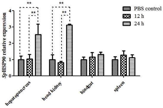 The transcript levels of SpHSP90 in the hepatopancreas and head kidney tissues showed no significant difference 12 h after LPS injection (Figure 9), whereas the levels in the two tissues strongly increased 24 h post LPS injection (p < 0.01). Notably, levels in the hindgut and spleen showed no significant changes either 12 or 24 h after LPS injection. The SpHSP90 gene expression level was generally relatively low after LPS stimulation.