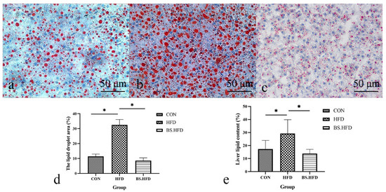 Oil red O staining and lipid content of C. idella liver; (a) CON, (b) HFD, (c) BS.HFD, (d) lipid droplet area proportion, (e) liver lipid content determined by Soxlet extraction. “*” means significant differences between groups (p < 0.05).