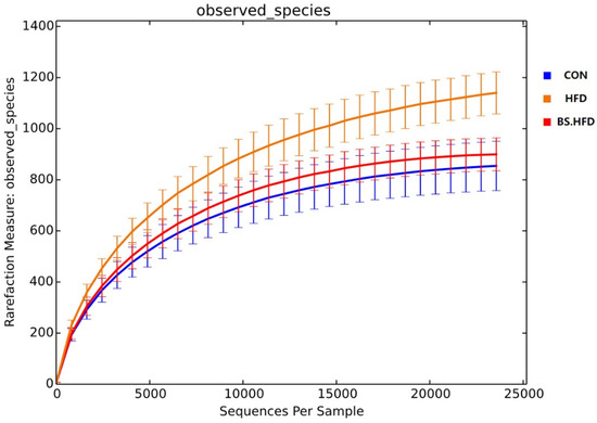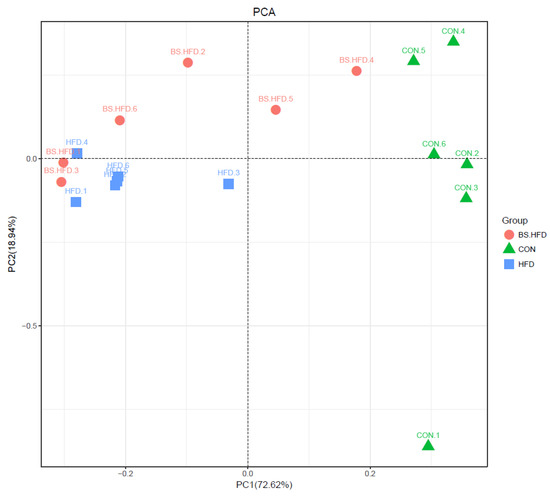 The OTU composition was analyzed through PCA to compare the differences in the intestinal microbiota (Figure 4). The results showed that the CON, HFD and BS.HFD groups clustered separately according and varied mainly on the PC1 axis, while the differences on the PC2 axis were not significant. This indicated that the high-fat diet changed the grass carp intestinal microbiota dramatically, while the addition of B. subtilis made the intestinal microbiota more similar to that of the CON group and attenuated the effects of the high-fat diet on the intestinal microbiota.