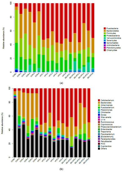 The relative abundance histogram of each sample was plotted at the phylum and genus levels (Figure 3, Table 5). At the phylum level, the dominant phyla in the intestinal microbiota in the CON group were Bacteroidetes (32.77%), Firmicutes (30.45%), Proteobacteria (18.28%), Fusobacteria (13.23%), Verrucomicrobia (3.72%), etc. The dominant phyla in the HFD group included Fusobacteria (51.76%), Proteobacteria (16.61%), Firmicutes (15.48%), Bacteroidetes (14.46%) and Verrucomicrobia (1.28%). The dominant phyla in the BS.HFD group were Fusobacteria (45.66%), Bacteroidetes (23.48%), Proteobacteria (12.32%), Firmicutes (9.41%), Verrucomicrobia (6.89%), Tenericutes (1.95%), etc.