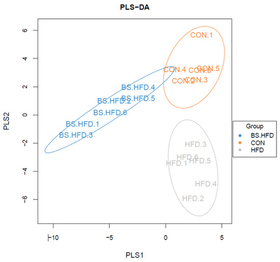 A PLS-DA (partial least-squares discriminant analysis) model was constructed based on the species abundance matrix and sample grouping data through R software (Figure 5). The results showed that the samples separately clustered according to their group; the CON and HFD groups were similarly distributed on the PLS1 axis and varied mainly on the PLS2 axis, while the BS.HFD group differed from the CON and HFD groups on the PLS1 axis, and distributed between the CON and HFD groups on the PLS2 axis.