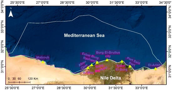 Egypt has a long coastline of nearly 1000 km along the Mediterranean Sea and nearly 2500 along the Red Sea, Gulf of Suez and Gulf of Aqaba, as well as several coastal lakes with high potentiality for the exploration of their natural resources. The selected area of study covers the economic zone of the marine Mediterranean coastal zone of Egypt. It extends nearly 1050 km from the eastern side of the Sinai Peninsula at the Egypt–Gaza border to the western side of Sallum at Egypt’s border with Libya (Figure 2). Geographically, the area of study is located between 25° west to 34° East and 32° north to 30° south. The fishing ground zones along the Egyptian Mediterranean coast are divided into four fishing regions: (1) Western region (including Matrouh, Alexandria and El-Max, Abu Quir, El-Maadiya and Rasheed), (2) Middle Delta (including Borg El-Burullus), (3) Damietta (including Izbet El-Borg), and (4) Eastern region (including Port Said and El-Arish).