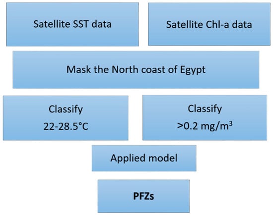 An adaptation of modern technology is needed to economize the ongoing marine fishing. Satellite remote sensing has a unique ability to carry out regular, repeated observations of the entire globe or specific regions at different spatial scales, and has been used to provide a wide range of observations to support fisheries and aquaculture management, when validated against in situ observations. Satellite remote sensing has been used to support marine fisheries by locating potential fishing zones (PFZs) using temperature and productivity data to identify the areas in which fish tend to aggregate for feeding []. Satellite data were widely used to detect the presence of different fish types by determining the important oceanographic parameters influencing fish accumulations, such as SST and Chl-a. These parameters are significant for studying the physical and biological conditions of water, and are commonly used to detect potential fishing zones [,,,,].