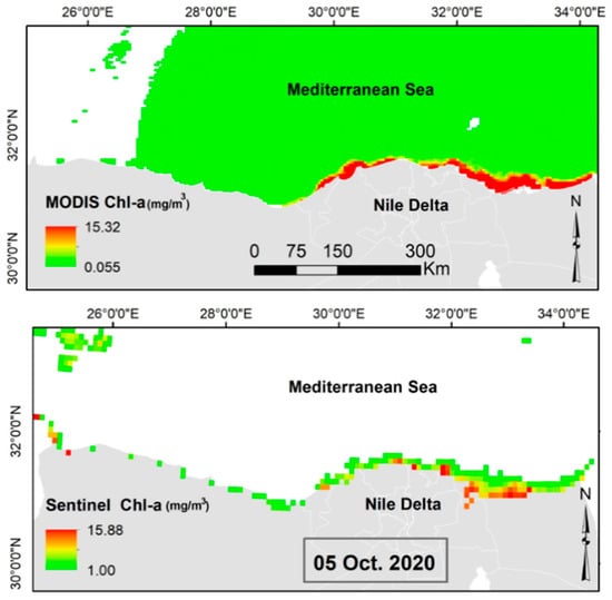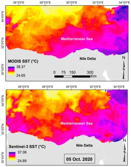 The data showed that sea-surface temperature along the coastal region is slightly higher than that in the open sea. The differences between near-shore SST and the SST of the open-sea ranged from 2 to 3 °C. Figure 4 presents a comparison of SST between both Sentinel-3 and MODIS on 5 October 2020, along the coastal zone of Egypt. This SST map shows higher values near to the coast compared to the open sea, and higher values are also observed in the western region than the eastern Mediterranean. There is a similarity in SST distribution from the two sources of data. The maximum SST was 38.37 °C and 37.06 °C, while the minimum SST was 24.65 °C and 24.89 °C, from MODIS and sentinel-3, respectively. A slight difference was noticed in the values, which may return to the different resolutions between the two sources of data. These variations in water temperature enhance the water’s upwelling movements and fish migration from cool to warm regions. This upwelling is important in the determination of fishing areas on the coasts [].