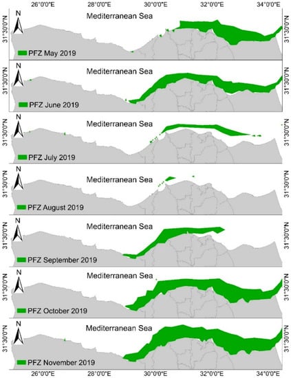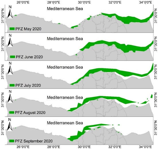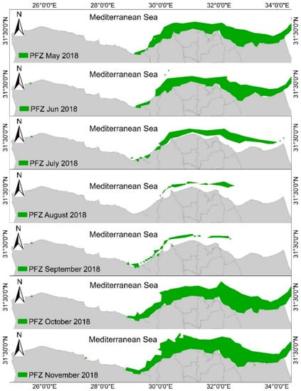The PFZ was detected at both inter-annual and monthly time scales for a 3-year period: 2018–2020 (Figure 6, Figure 7 and Figure 8). The results showed a larger area of PFZ during the warm months (mainly summer), e.g., from May to July, while they declined during August and September, before increasing once again in October and November. August showed the lowest area compared to the other months (see Figure 9). Moreover, a temporal variation was observed in PFZs during the same months in different years; for example, the PFZs for May 2018 were wider than those for May 2019, which may return to SST fluctuations effect. In which the maximum SST values in May 2018 ranged between 21 and 24 °C, while in May 2019 it ranged between 20 and 22 °C.