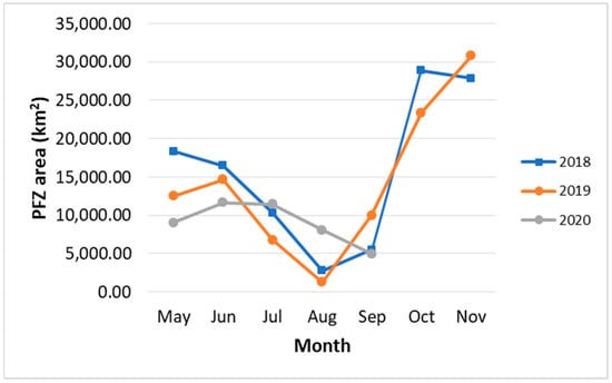 Monthly variations in PFZ area for Sardinella aurita during 2018–2020.