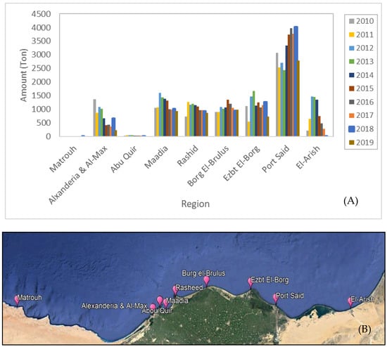 (A) The annual sardine catches along the north coast according to (B) the landing site from Matrouh to El-Arish from 2010 to 2019.