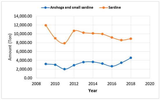 It is anticipated that this research would help the fishery’ authorities and local fishermen to easily identify the areas of sardine aggregation, and increase their catch per unit effort. There was a noted reduction in the amount of sardine catches produced from 2009 to 2019, as reported by GARFD and shown in Figure 11. Baali et al. [] study showed an increase in S. aurita landings from the year 2010; the maximum values were observed during the period ranging from 2011 to 2013, with high concentrations of Chl-a (2.28 mg m–3) and SST (18.74 °C). Then, the S. aurita landings began to decrease, reaching their minimum values in 2016. This decrease was also observed for the concentration of Chl-a (1.90 mg m–3) and SST (18.58 °C) in recent years.