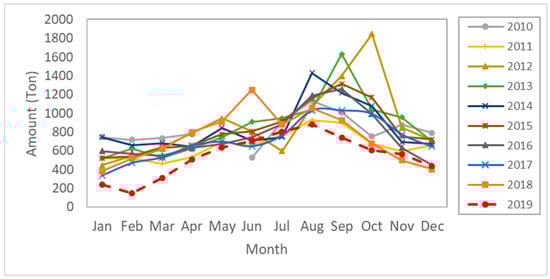 The amount of sardines changed monthly from 2010 to 2019, as shown in Figure 12, with a high amount (about 1844 Ton) on October 2012, and the lowest amount (about 145 Ton) in February 2019. The year 2019 showed a low trend in terms of sardine catch compared with the historical record. This matches the previous results of PFZs of S. Aurita, showing that the area increases during months of SST ranges from 22 to 28.5 °C. The low temperature in February (winter) led to a reduction in the fish production while, in October, the temperature was moderate and suitable for fish aggregations. Baali et al.’s [] results showed a maximum of S. aurita landings in October (6698 Ton), with a minimum in June (2493 Ton). From June, the SST began to increase and reached its maximum value in summer, then decreased, reaching its minimum values in winter. The monthly average Chl-a showed two patterns: (1) a period of high Chl-a content from May to November, with a peak in September, and (2) a period of low Chl-a content from December to April.