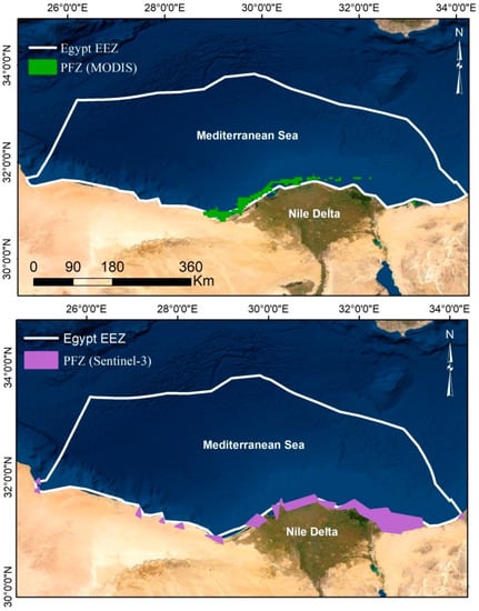 A comparison of the produced PFZ was performed between MODIS and Sentinel-3 on different days. Figure 13 shows an example of PFZ from both sensors on 5 October 2020. The produced PFZ covers the coastal region of the Nile Delta.