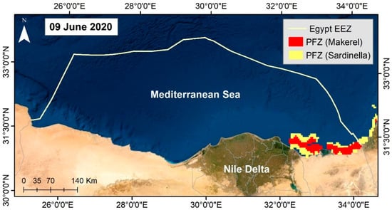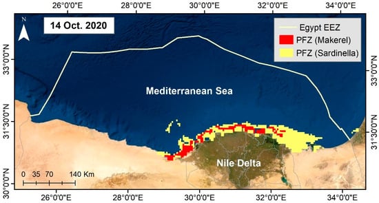 With the great role marine fisheries play in increasing the economy of Egypt, it is crucial to implement efficient methodologies and technologies to secure the maximum benefit. In conclusion, satellite remote sensing proved its ability to generate and classify marine ecological regions by using products such as SST and chlorophyll-a. This research highlighted the potential role of earth observations in detecting the potential zones of fish aggregation, which can somehow benefit the fishing community, and reduce the time and effort spent searching the schools of fish, improving the profitability and, hence, the socio-economic status. In addition, this leads toa good yield of fish and boost the economic status of fishermen, especially small-scale fishers. This study indicated that SST values during the summer months were higher than those in the winter months by about 7–10 °C. Chl-a concentrations were relatively high and available throughout the year. The PFZ model was applied based on satellite data (SST and Chl-a) to robustly produce the PFZs maps for Sardinella aurita. The majority of the potential fishing zones were located near the coast and near the mouths of the discharge from the land, increasing the nutrients and food web. The produced maps suggest that the abundant months for Sardinella aurita were from May to November, due to the effect of SST distribution. The model enabled the mapping of other fish species of Makerel Tuna for large-scale fishermen.