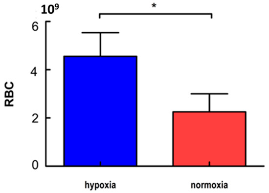 The number of erythrocytes in the hypoxia group was 4.56 × 109/mL. The number of erythrocytes in the normoxia group was 2.25 × 109/mL (Figure 1). The number of erythrocytes in zebrafish from the hypoxia group was significantly higher than that in the normoxia group (p < 0.05) (Figure 1).