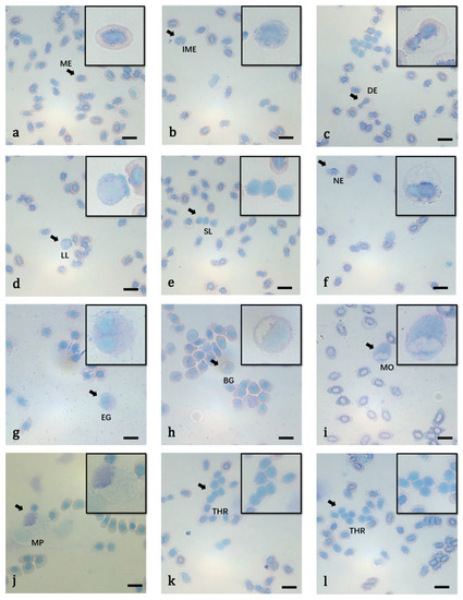 The microstructure of peripheral blood cells of zebrafish (Wright-Giemsa staining). (a) Mature erythrocyte (ME) (arrow); (b) immature erythrocyte (IME) (arrow); (c) dividing erythrocyte (DE) (arrow); (d) large lymphocyte (LL) (arrow); (e) small lymphocyte (SL) (arrow); (f) neutrophil (NE) (arrow); (g) eosinophils (EG) (arrow); (h) basophilic granulocyte (BG) (arrow); (i) monocyte (MO) (arrow); (j) macrophage (MP) (arrow); (k,l) thrombocytes in clusters (TH) (arrow). Bars = 10 μm.