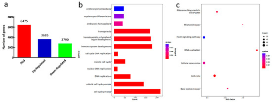 There are three categories in the GO database: biological process (BP), cellular component (CC) and molecular function (MF). The GO enrichment analysis of the DEGs between the hypoxia and normoxia zebrafish showed that the DEGs were mainly summarized in 246 biological processes, 50 cellular component and 46 molecular functions (Table S2). It was clearly shown that the DEGs were enriched in many GO terms involved in hematopoiesis, immunity and cell proliferation processes, such as hemopoiesis, immune system development and cell cycle process (Figure 3b). The KEGG annotation showed that many DEGs were related to the cell proliferation pathways, such as DNA replication and Cell cycle (Figure 3c).