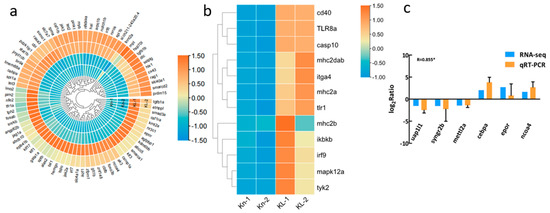 DEGs involved in the hematopoiesis process and immunity response and qRT-PCR results. (a) Heatmap of DEGs involved in the hematopoiesis process. (b) Heatmap of DEGs involved in the immunity response. Kn-1 and Kn-2 are the normoxia zebrafish group and KL-1 and KL-2 are the hypoxia group. (c) Comparison of gene expression between the RNA-seq and qRT-PCR data. The qRT-PCR results in the bar graph are shown as mean +/- standard deviation. The Pearson correlation coefficient (R) was used to measure the correlation between RT-qPCR and RNA-seq results. Moreover, * indicates significant correlation (p < 0.05).