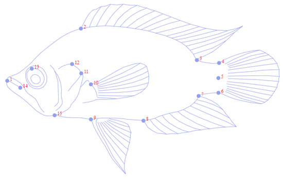 In order to obtain the images, individuals were fixed with pins and placed on a white Styrofoam base in an anterior–posterior position with fins extended. Additionally, a scale ruler was used to establish the scale when the picture was taken. The photographs were taken with a high-resolution FUJIFILM camera with 24 Megapixels. Landmarks were established following Corti and Crosetti [36], Soria et al. [37] and Aguirre and Jiménez-Prado [38] criteria, and they were digitized and converted into coordinates in a bidimensional plane using the tpsDig2 [39] software. In total, 15 landmarks were identified (Table 1), as shown in Figure 2.