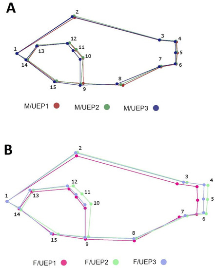 44. Fruciano, C. Measurment error in geometric morphometrics. Dev. Genes Evol. 2016, 226, 139–158. [Google Scholar] [CrossRef] [PubMed]