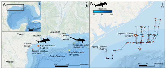 The Gulf of Mexico (GOM) is a region where many highly migratory pelagic shark species overlap, while in close proximity to coastal influences, such as the potential for interacting with anthropogenic activities including recreational and commercial fishing [11,12]. The scalloped hammerhead (Sphyrna lewini) and the bigeye thresher (Alopias superciliosus) are large, circumglobal species that occupy temperate, sub-tropical, and tropical areas in coastal and offshore waters such as the GOM [13,14]. Both species are of critical conservation concern, with scalloped hammerheads listed as Critically Endangered and bigeye threshers listed as Vulnerable by the International Union for Conservation of Nature (IUCN) Red List Assessment [11,15,16,17,18]. In addition to being taken as bycatch, scalloped hammerheads are targeted for the international fin trade and have some of the highest recorded at-vessel mortality rates in bottom longline fisheries due to their smaller gape sizes compared to other ram ventilating sharks [19,20,21]. As of 2007, thresher sharks (Family Alopiidae) including bigeye threshers in the GOM had seen a 63% decline in abundance [22]. For both scalloped hammerhead and bigeye thresher sharks, conservation actions (e.g., CITES; US Endangered Species Act) are in place, yet their populations are still exhibiting decreasing population trends, and with the difficulty of gathering information on these large, pelagic species, it is difficult to estimate the likelihood of a reduced assessment status in the future [23]. While information is available on the spatial ecology of these two species, most of the work has been done in the Pacific and Atlantic Oceans, leaving gaps in our understanding for these species in the GOM.