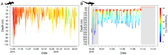 Vertical habitat use profiles for (A) a scalloped hammerhead shark and (B) a bigeye thresher shark, satellite tagged in the northern Gulf of Mexico. Scalloped hammerhead shark depth and temperature data were archived every 5 min and transmitted from a MiniPat (Wildlife Computers, Inc.) after a 90 d deployment. Bigeye thresher shark depth and temperature data were archived every 2 min and transmitted from a high-rate PSAT X-tag (Microwave Telemetry, Inc.) after a 15 d deployment. Gray areas at the beginning of each figure denote the first 48 h of post-tagging abnormal behavior removed from analysis. Gray area at the end of the track of the bigeye thresher shark denotes when the X-tag prematurely popped off on 11 November 2019 and was removed from analysis.