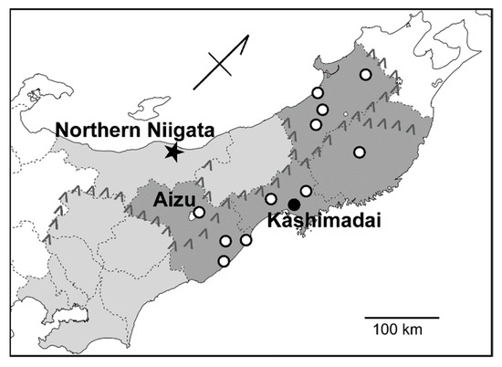 - Saitoh, K.; Suzuki, N.; Ozaki, M.; Ishii, K.; Sado, T.; Morosawa, T.; Tsunagawa, T.; Tsuchiya, M. Natural habitats uncovered?—Genetic structure of known and newly found localities of the endangered bitterling Pseudorhodeus tanago (Cyprinidae). Nat. Conserv. 2017, 17, 19–33. [Google Scholar] [CrossRef]