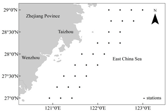 Sampling stations for the distribution of fish resources and hydrological environment sampling stations in offshore waters south of Zhejiang.
