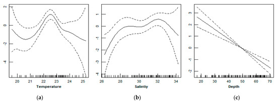 In this study, water depth was the environmental factor with the largest deviation explanation rate in Spring-GAM and Autumn-GAM, and water temperature was the environmental factor with the largest deviation explanation rate in Summer-GAM, while water temperature, salinity and water depth appeared in all models. Thus, this study concluded that water temperature, salinity and water depth were the important influencing factors affecting the distribution of D. maruadsi resources offshore of southern Zhejiang, China.