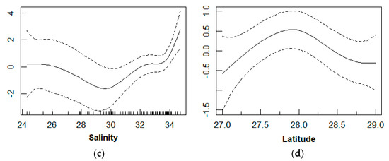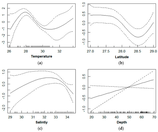The results of modeling by season are shown in Table 2. The best combination of variables in spring was water temperature, salinity and water depth, with a deviation explanation rate of 42.4%, while all three factors were significant influencing factors (p < 0.05). The best combination of variables in summer was water temperature, salinity, water depth and latitude, with a deviation explanation of 46.5%, and water temperature and latitude were significant influencing factors (p < 0.05). The best combination of variables in autumn was water temperature, salinity, depth and latitude, with a deviation explanation of 59% and salinity as a significant factor (p < 0.05). In contrast, in Yearly-GAM, the best combination of variables was season, water temperature, salinity, water depth and offshore distance, with 34.3% of the deviation explained.