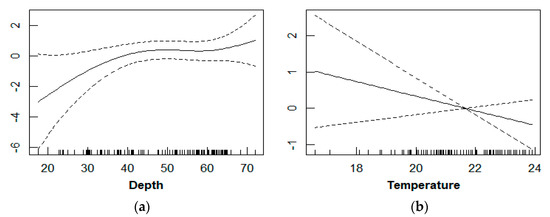 Water depth, as a comprehensive influencing factor, can not only directly reflect changes in pressure and light intensity but also indirectly reflect changes in environmental conditions such as water temperature and salinity [9,50]. Related studies have shown [42] that D. maruadsi are mainly concentrated in inshore waters in spring for spawning and baiting, while in summer and autumn, they are mainly adult fish, which are more adaptable to the environment and can enter deeper waters for baiting and feeding. In the present study, the seasonal model also showed that D. maruadsi was concentrated in shallow waters in spring and in deeper waters in summer and autumn (Figure 2, Figure 3 and Figure 4). However, in the Yearly-GAM, the density showed an increasing then decreasing trend, and then stabilized, and reached a maximum at 27 m (Figure 5), which is different from the results of the seasonal modeling and the actual situation. This may be because the living habits of D. maruadsi vary significantly in different seasons [3,42], whereas Yearly-GAM is modeled with year-round data, which to a certain extent weakens the differences in living habits of D. maruadsi in different seasons.