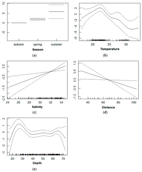 Relationship between the density of D. maruadsi and environmental factors in coastal waters of southern Zhejiang at interannual scales: (a) effect of season; (b) effect of temperature; (c) effect of salinity; (d) effect of distance and (e) effect of depth. Dashed lines show 95% confidence intervals.