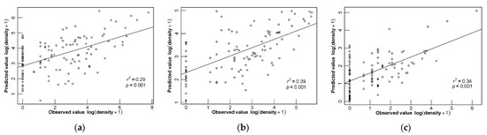 Scatter diagram of observed and predicted densities of D. maruadsi by season. (a) Spring; (b) Summer; (c) Autumn.