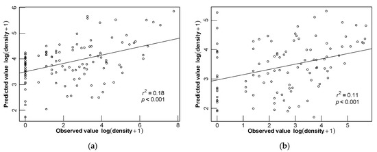 - To evaluate the fitting effect between different models, this study used two different modeling approaches to predict the density of each station in each year and season and calculated the coefficient of determination (R2) and the significance (P) between the predicted and observed values.