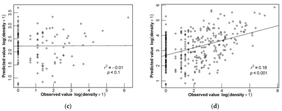 Scatter plots of observed and predicted densities of D. maruadsi in Yearly-GAM. (a) spring; (b) summer; (c) autumn; (d) whole year.