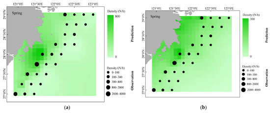 - To assess the differences in the accuracy of predicting the spatial distribution of fishery resources by different modeling approaches, this study predicts the spatial distribution of D. maruadsi in different seasons by using two modeling approaches. A total of 420 quadrilateral grids were created for model prediction in the study area with a spatial resolution of 0.1° × 0.1°. The environmental factors in each grid were interpolated by using inverse distance weighting (IDW). The mean values of the observed and predicted values of D. maruadsi in different seasons from 2015 to 2020 were also superimposed and combined with the living habits of D. maruadsi to evaluate the prediction effects of the two modeling approaches.