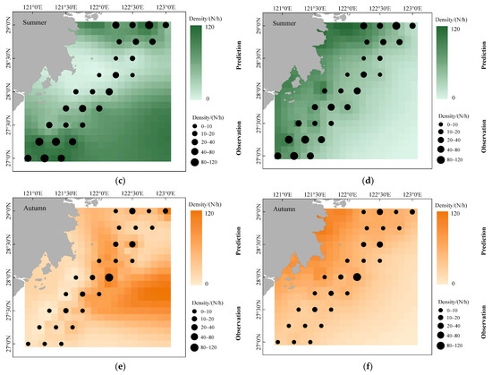 In this study, by using the mean values of the D. maruadsi density in spring, summer and autumn from 2015 to 2020 to map its spatial distribution, it was found that D. maruadsi showed different distribution patterns in different seasons (Figure 2). Among them, the density in spring was significantly higher than that in summer and autumn. In spring, D. maruadsi was mainly distributed in inshore waters south of 28° N and 29° N. Compared with spring, D. maruadsi in summer was mainly concentrated in waters north of 28°45′ N and south of 27°45′ N. In autumn, the distribution pattern of D. maruadsi density was opposite to that of spring, showing the distribution characteristics that waters on the seaward side had a higher D. maruadsi density than inshore waters, with the resource mainly distributed in the outer waters at and north of 28° N (Figure 8). In this study, by comparing the predicted and observed values of the two modeling approaches, we found that although there are some differences between the predicted and observed values of these two types of models, the predictive performance of the model built by season is significantly higher than that of Yearly-GAM and closer to the real density (Figure 8). In addition, this study also found that, in Yearly-GAM, the predicted resource densities in all three seasons showed the distribution characteristics that inshore waters had a significantly higher D. maruadsi density than that in offshore waters, while in the model built by season, the three seasons showed different distribution characteristics.